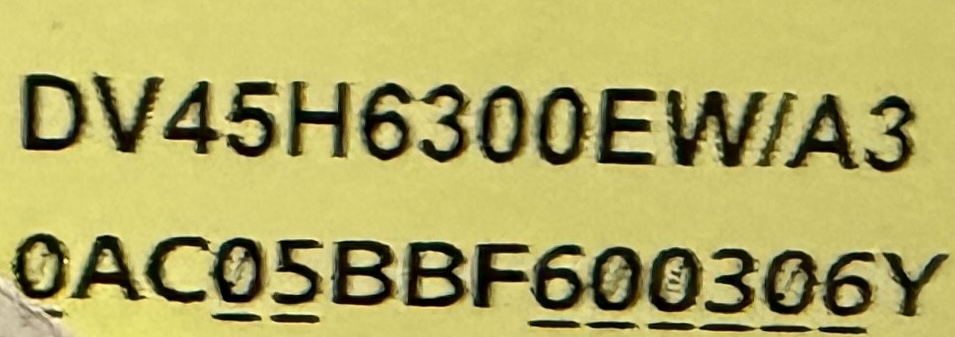 Model/Serial: DV45H6300EW/A3 / 0AC05BBF600306Y