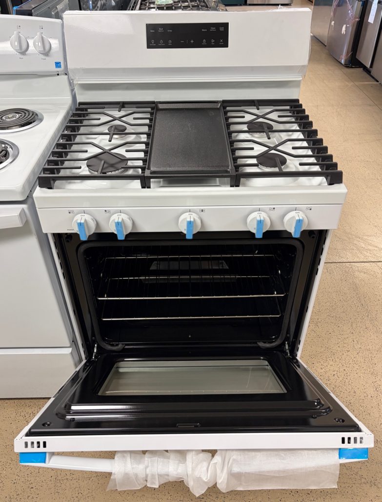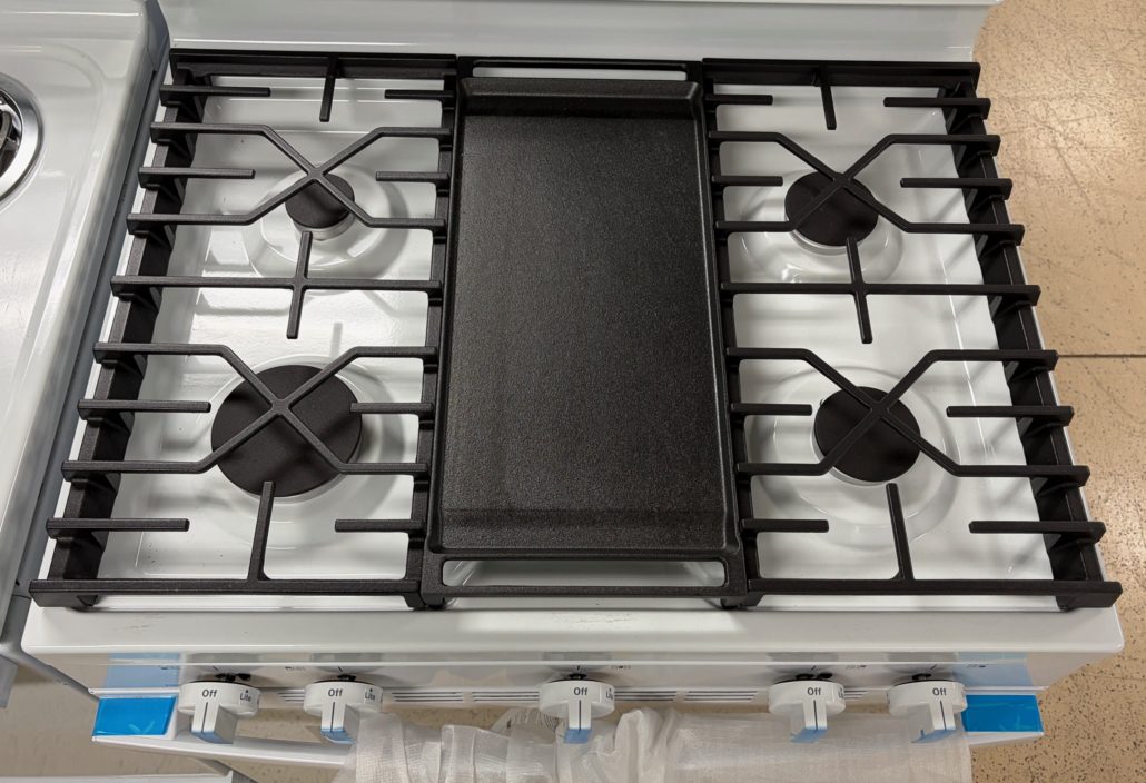 Beautiful new range with 5 Sealed Burners, 5.3 cu. ft. Oven Capacity, Power Boil™ Burner, Griddle, Storage Drawer, Express Preheat, Enhanced Shabbos Mode Built In, and Self & Steam Clean!